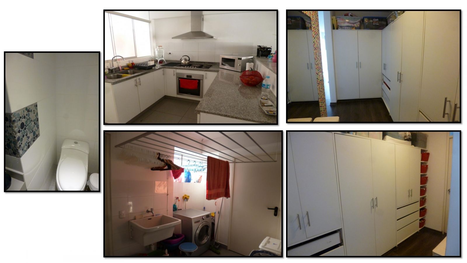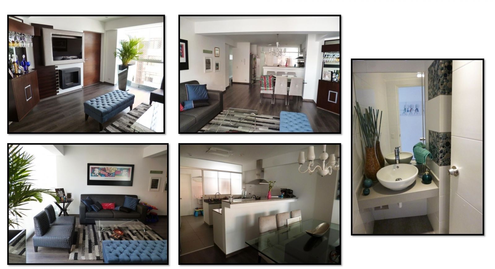 Tiene una amplia sala-comedor con chimenea electrónica, cocina tipo americano, lavandería, cuarto/baño de servicio y puerta a escaleras. Baño de visitas, 3 dormitorios y 2 baños completos (1 incorporado al dormitorio principal). El dormitorio principal es amplio, entra cama king size y tiene walk-in closet y un lindo baño incorporado. Otro dormitorio está decorado como para niña pero se puede cambiar o quitar y el tercer dormitorio esta ahora como un estudio. Todo el departamento tiene en sus ventanas grandes malla de seguridad por los niños pero se puede quitar. Se alquila con línea blanca (cocina, refrigerador y lavadora/secadora), juego de sala y de comedor y se podrían dejar camas, es cosa de conversar. Abajo hay una cochera techada. El parqueo queda en el primer nivel de semisótano.